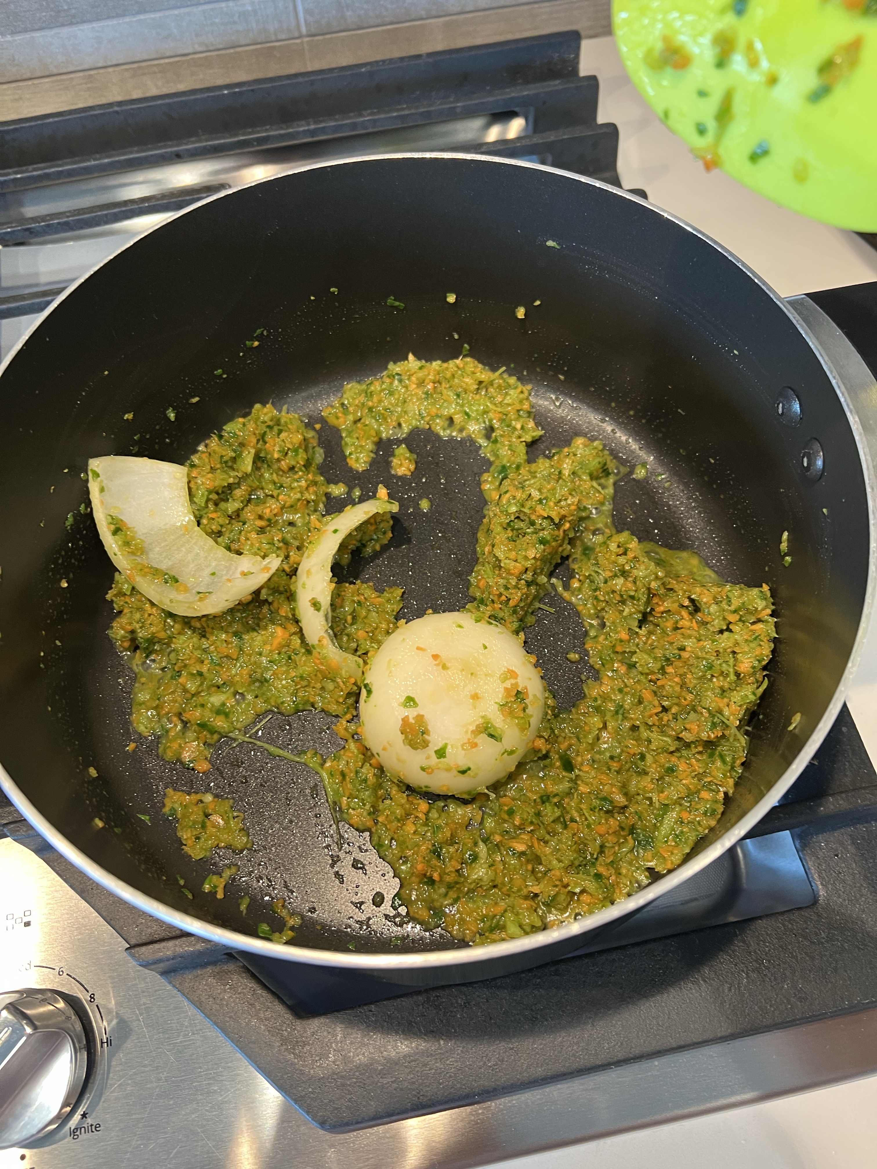 - Pulse onion, celery, carrot and spinach in a food processor until very finely chopped. Transfer to a small bowl.
