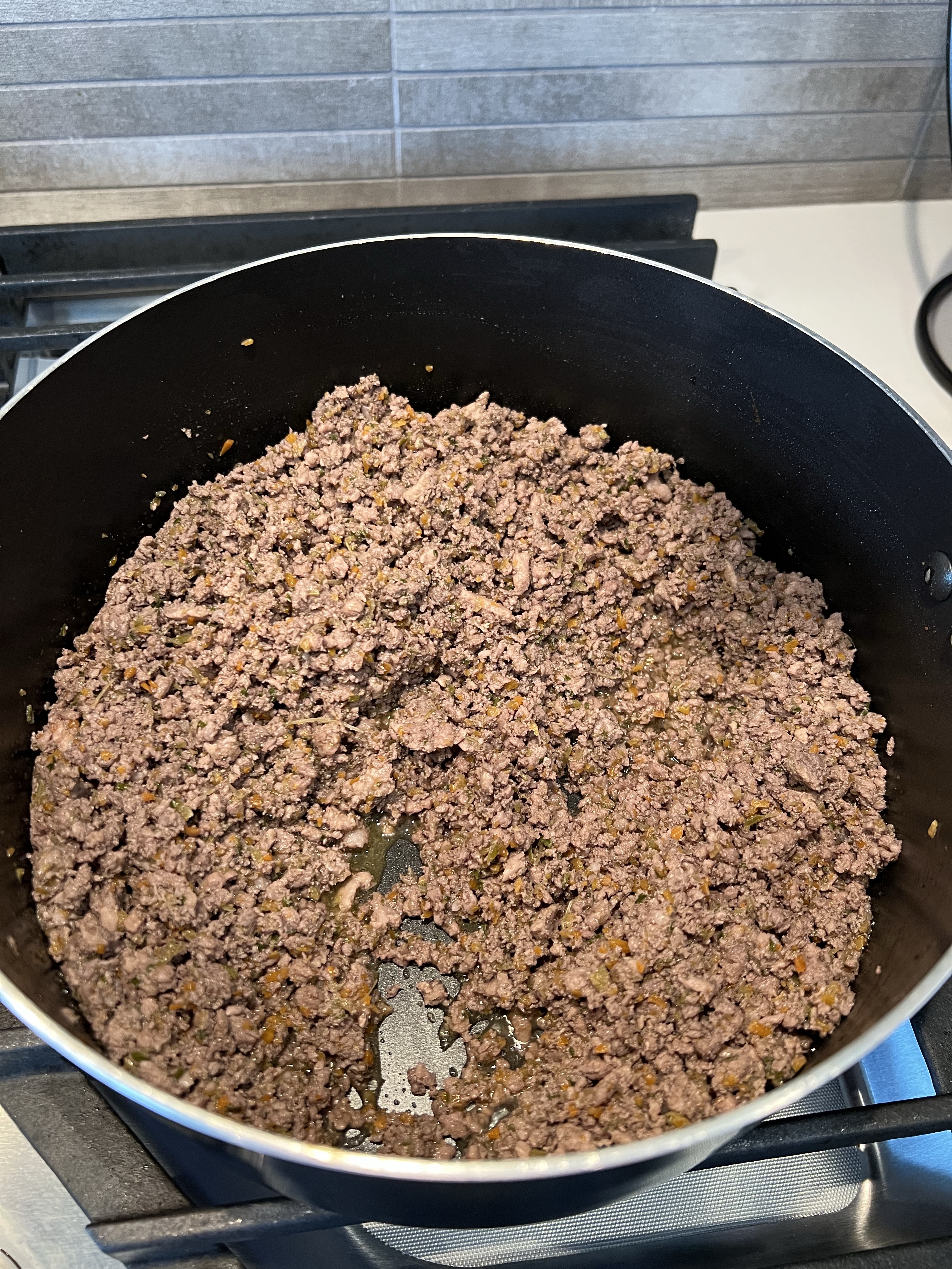 - Add ground meat to pot and pour in wine. Reduce heat to medium-low and cook, smashing down on meat with a wooden spoon, until wine is evaporated, surface of pot is almost dry, and meat is finely ground, about 30 minutes. (The meat should be reduced to what looks like little bits. It takes a bit of effort, but you can take breaks.)