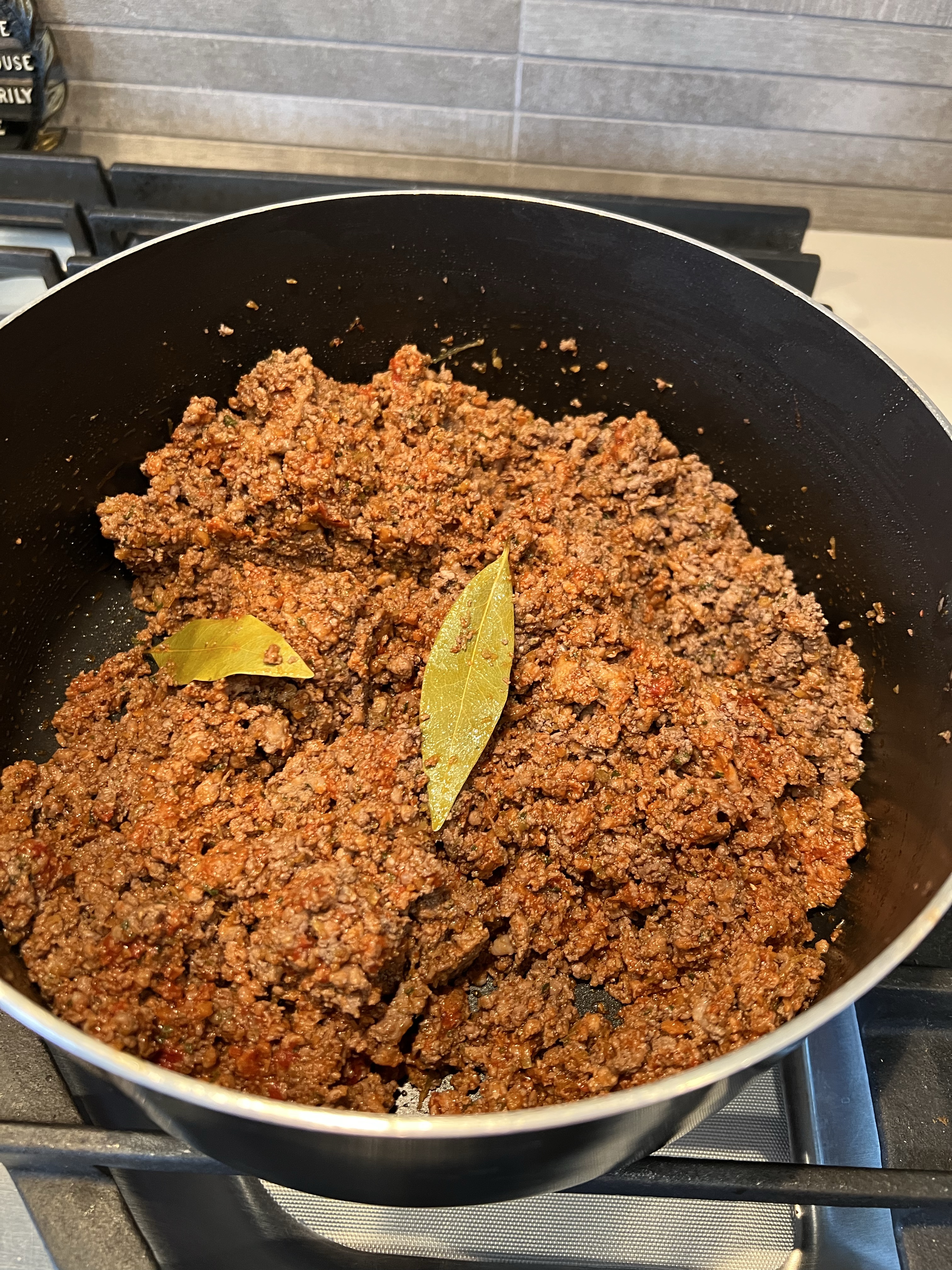 - Add tomato paste, bay leaf, and nutmeg and cook, stirring occasionally and still pressing down on meat, until tomato paste is slightly darkened, about 10 minutes.
