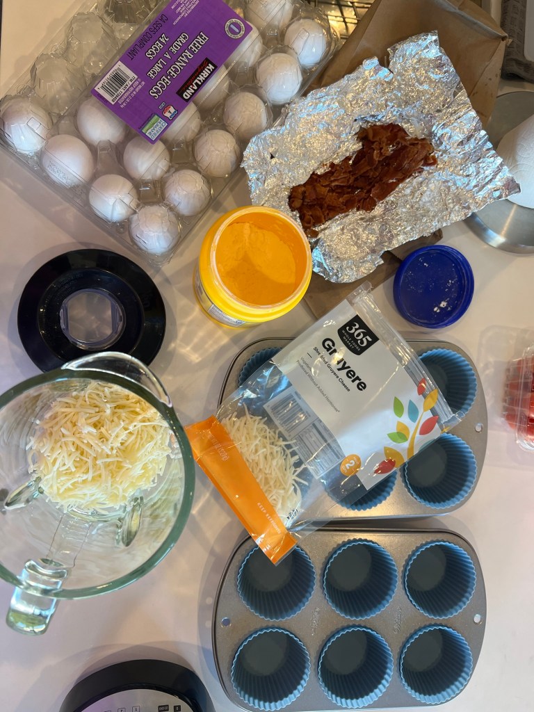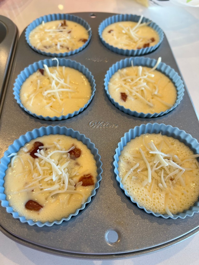 Pour the egg mixture evenly into the muffin pan, filling each about three quarters full. If you’d like to add additional toppings, like bacon or extra cheese, you can sprinkle those on top of the batter and press them into the batter before putting into the oven.